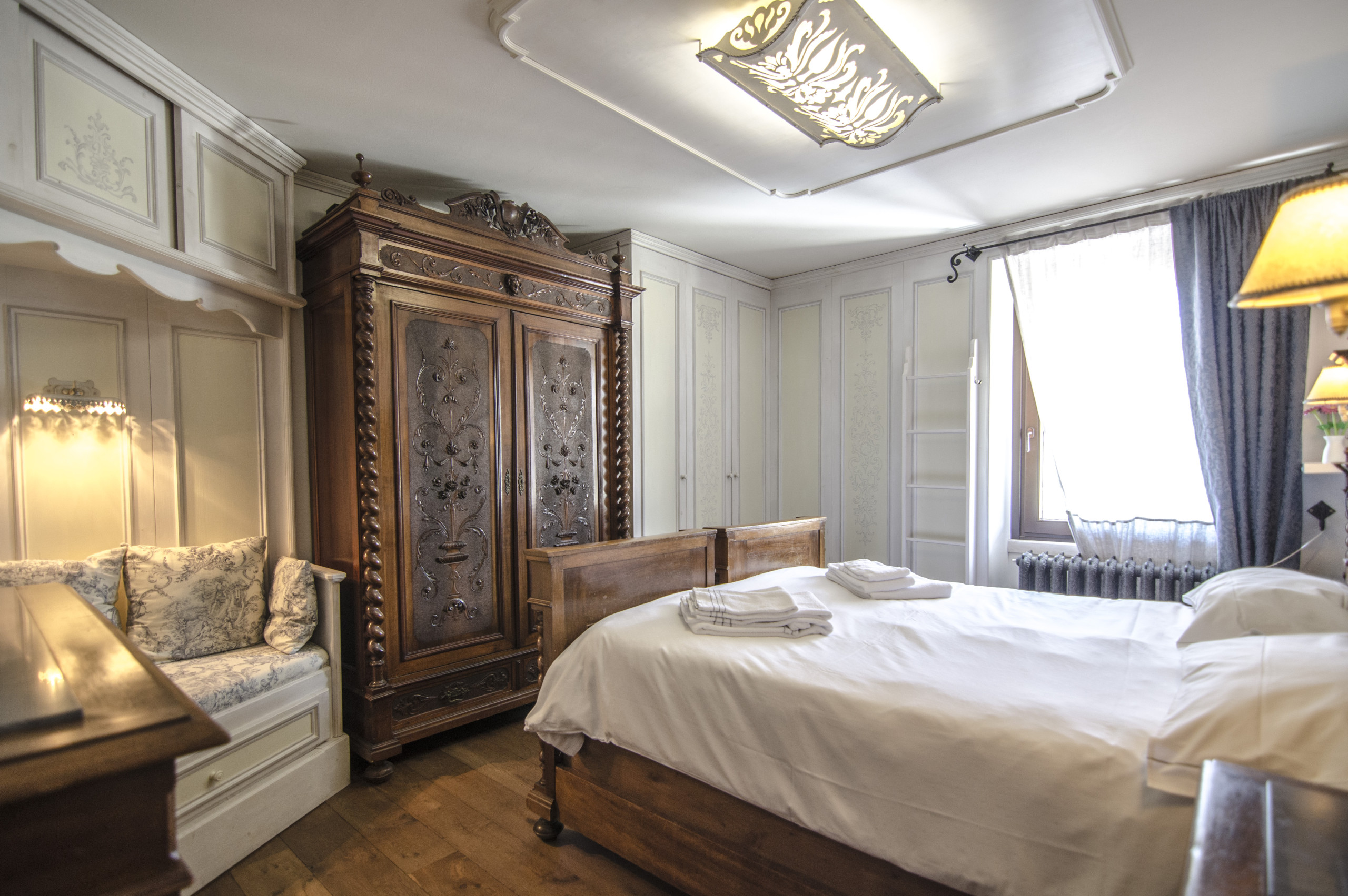 The apartment features a cozy double bedroom, elegantly furnished in a refined alpine style with natural tones that invite rest and relaxation. The bathroom is modern and well-appointed, offering all the comforts you need in a beautifully curated space.
