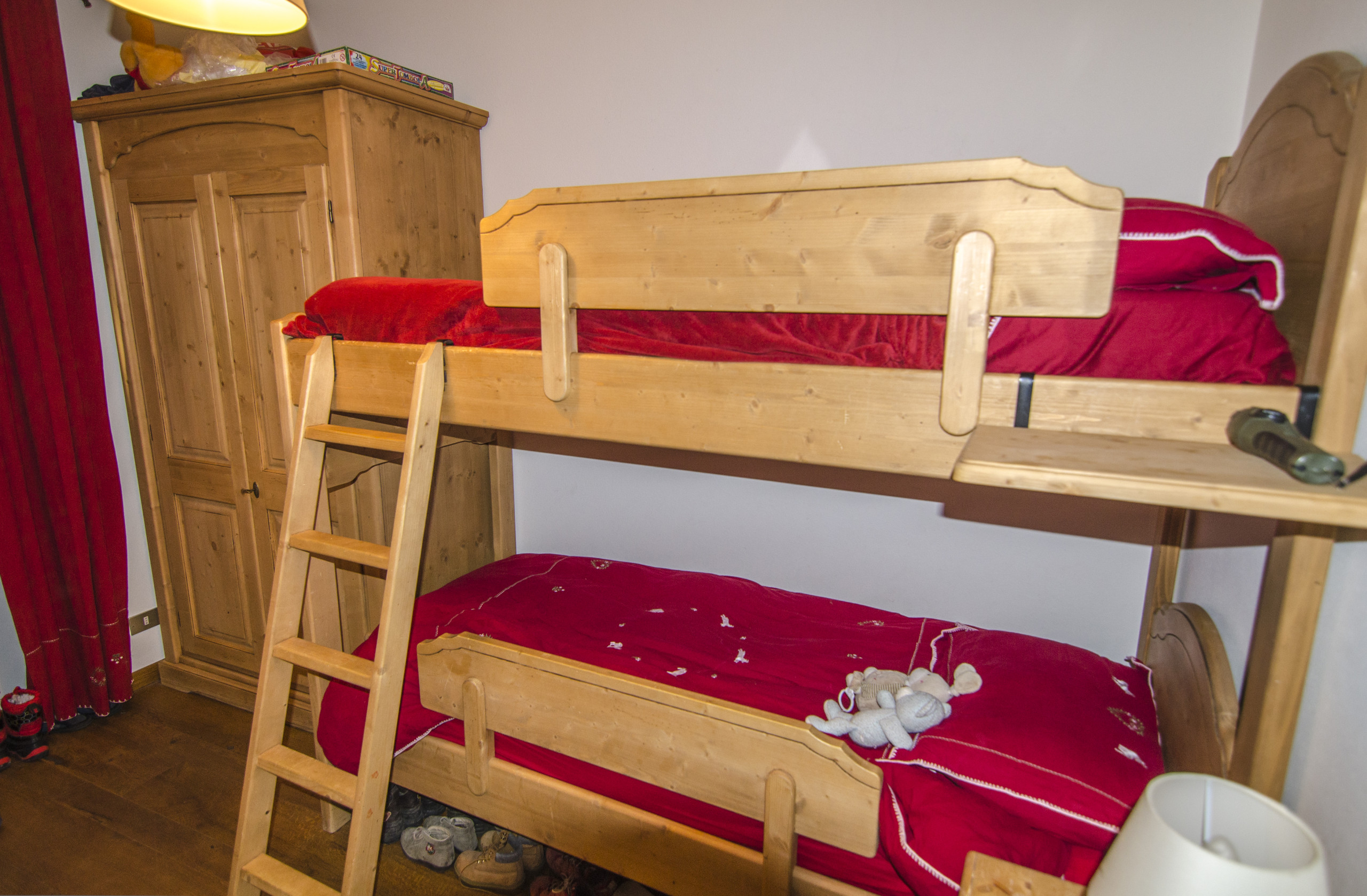 The apartment features a bright living room, a fully equipped kitchen, one double bedroom, one bedroom with bunk beds, and a bathroom. The property also includes a private parking space in a garage, offering comfort in every season.